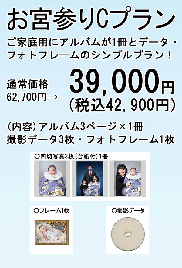 お宮参りや百日記念の撮影でご利用できる写真撮影・アルバム・フォトフレーム・キーホルダー・撮影データまでが含まれたお勧めのプラン!さらに、赤ちゃんが着る着物(祝い着)は無料でレンタルできます。